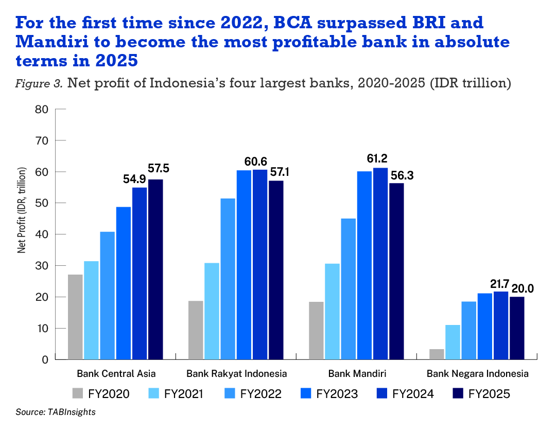 For the first time since 2022, BCA surpassed BRI and Mandiri to become the most profitable bank in absolute terms in 2025.