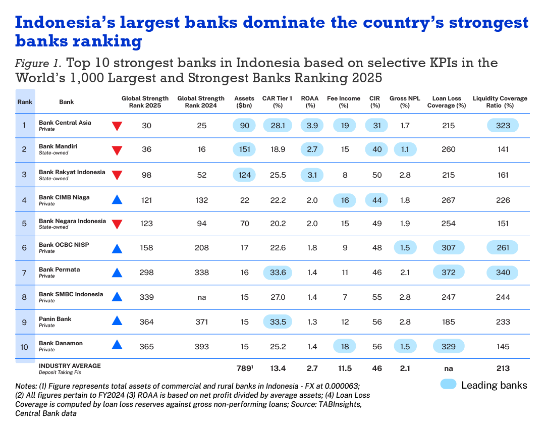 The leading banks among the top 10 strongest banks in Indonesia are dominated by the four largest—BCA, Mandiri, BRI and BNI. However, all four of the largest banks dropped in the 2025 rankings. Indonesia's four largest banks faced a common set of headwinds in 2024: NIM compression as elevated Bank Indonesia rates raised funding costs, operating expense growth that outpaced revenue and loan books expanding significantly faster than deposit bases — pushing loan to deposit ratios sharply higher and tightening liquidity buffers.