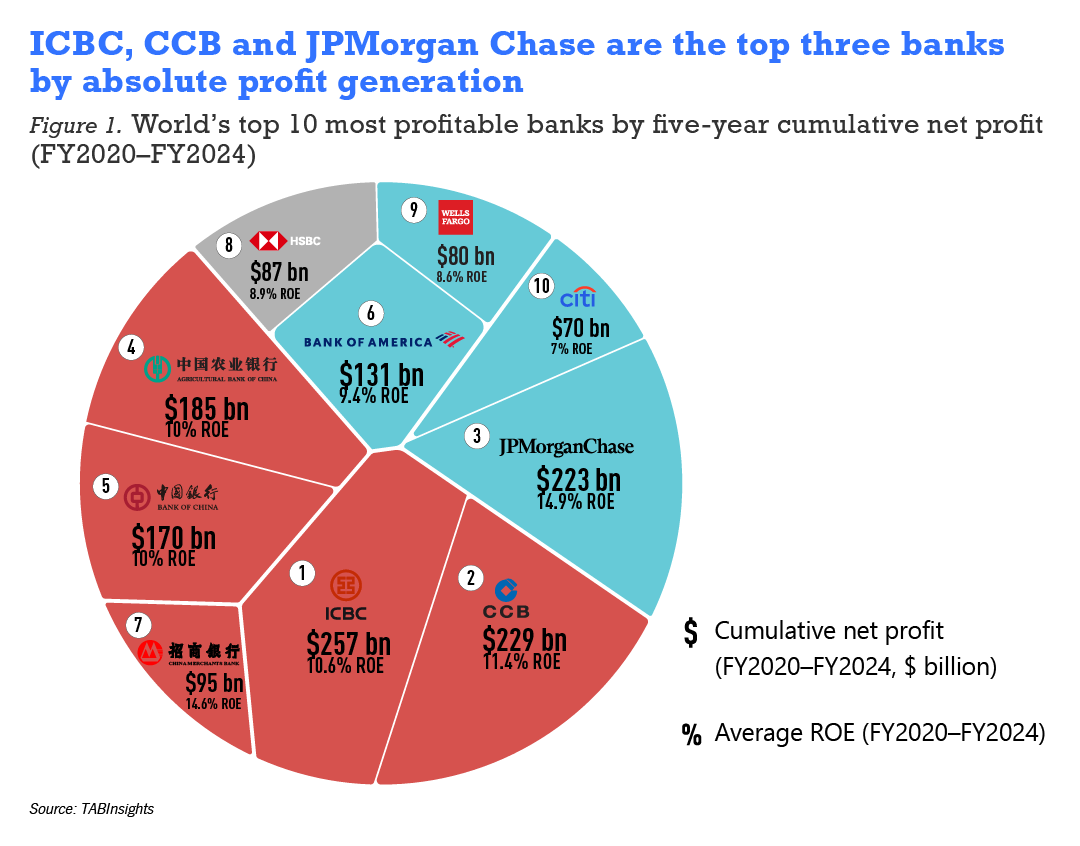 Chinese banks accounted for half of the top 10 institutions ranked by cumulative net profit between 2020 and 2024. Industrial and Commercial Bank of China (ICBC) ranked first with $257 billion, followed by China Construction Bank (CCB) at $229 billion, Agricultural Bank of China (ABC) at $185 billion and Bank of China (BOC) $170 billion.