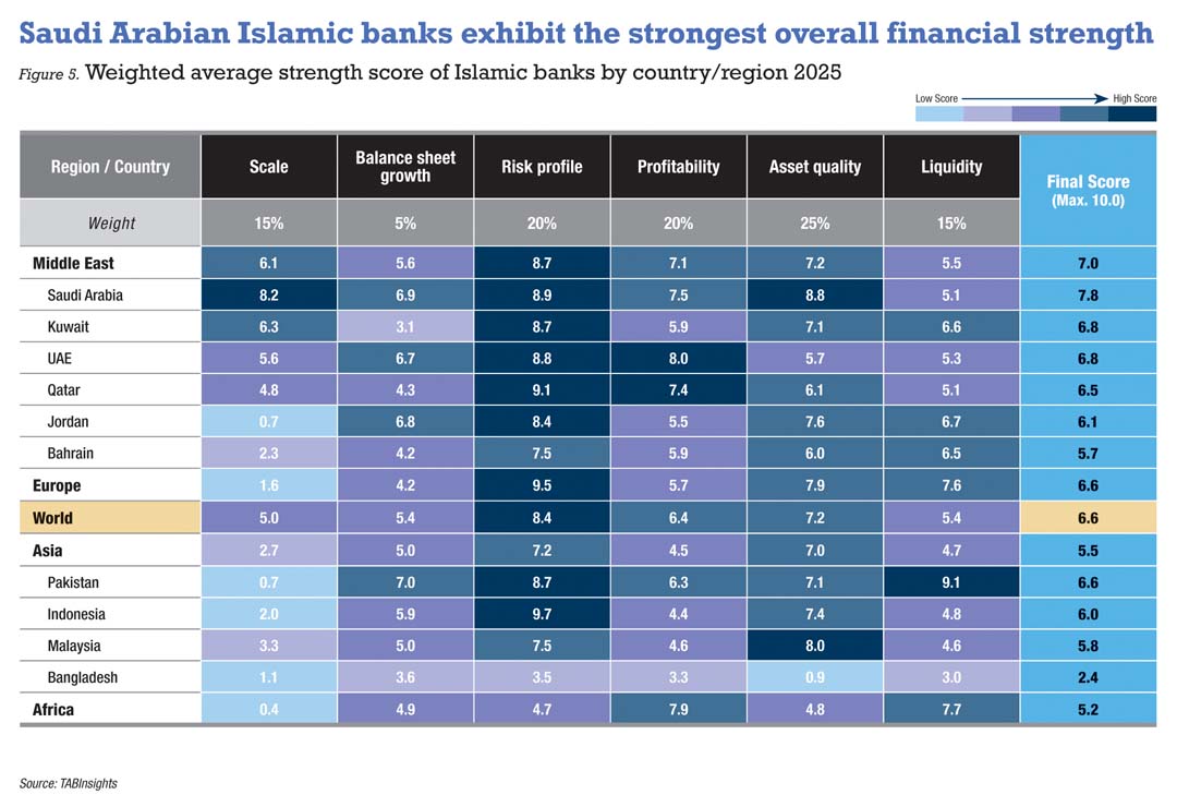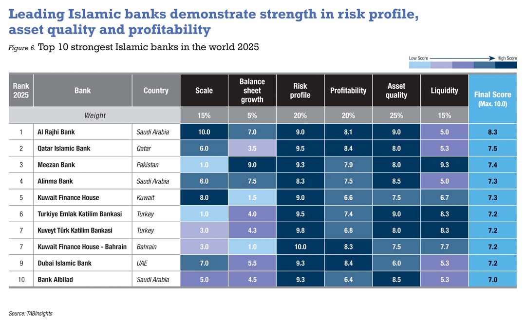 The strongest Islamic banks ranking shows that Saudi Arabian Islamic banks continue to record the highest overall strength. The ranking employs a transparent scorecard covering six dimensions—scale, balance sheet growth, risk profile, profitability, asset quality and liquidity—across 14 metrics to provide a rigorous comparison of global Islamic banking performance.